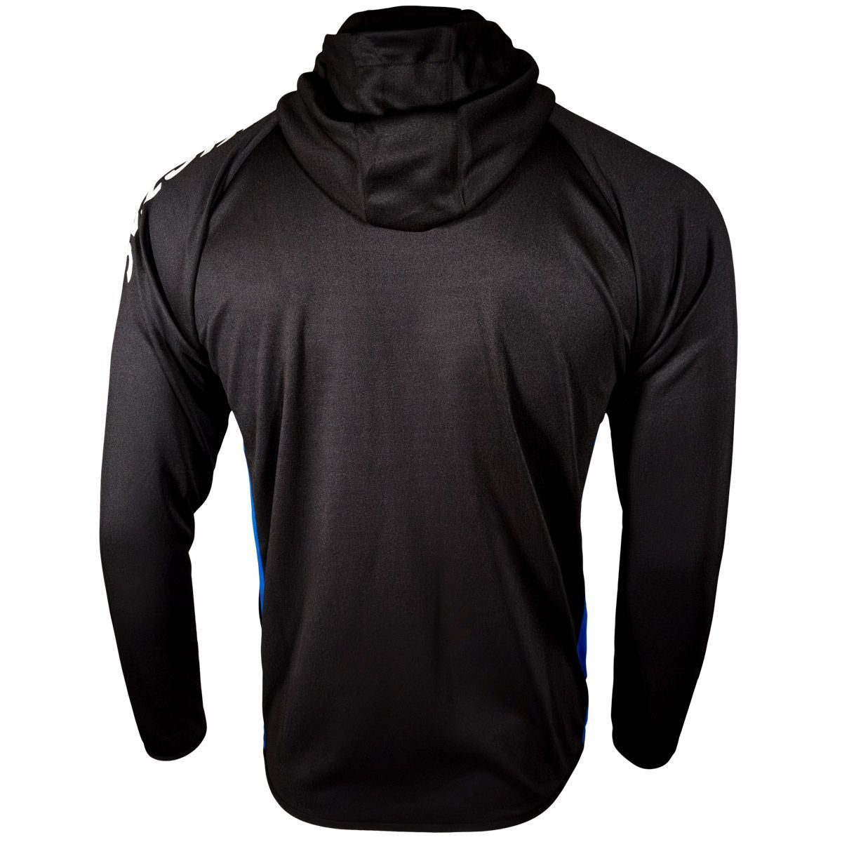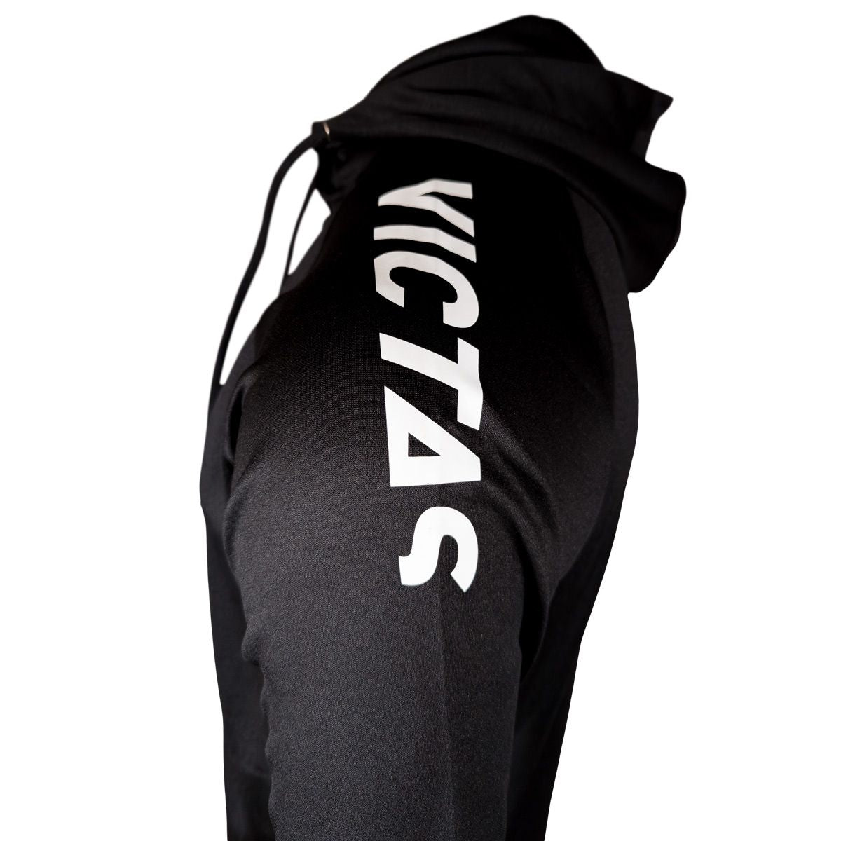 Premium tracksuit with hood made of particularly high-quality and elastic functional material. With its sporty cut, the training jacket is ideal for both training and leisure. The practical zipped side pockets on the jacket and trousers as well as the elastic waistband and zipped leg cuffs underline the functionality. VICTAS lettering on the left shoulder.