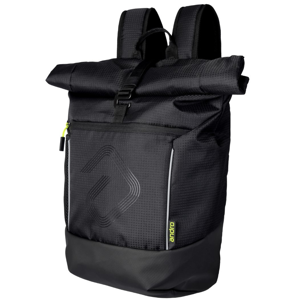 Fashionable roll-top backpack with lots of storage space. Spacious main compartment with zipped inner pocket and integrated laptop compartment. Smaller zipped pocket on the front and air mesh pocket on the side. Comfortable back padding and padded loops provide a high level of comfort. Robust material that protects against moisture.