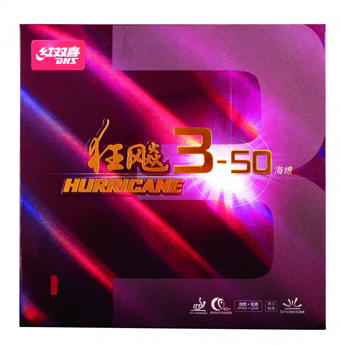 Das DHS Hurricane 3-50 ist eher eine sanftere Variante des traditionellen Hurricane 3er-Gummi. Das Zusammenspiel der bewährten H3-Gummioberfläche und der #50-Unterlage eröffnet neue Spielmöglichkeiten. Die Kombination aus elastischer Unterlage und griffiger Gummioberfläche sorgt für so viel Grip, dass der Ball deutlich leichter zu steuern ist.