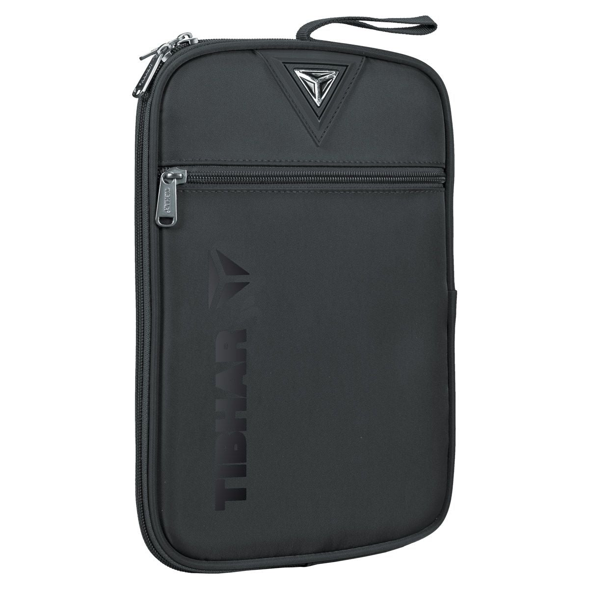 Eine extra kleine Reißverschlusstasche an der Vorderseite der Schlägerhülle und ein Tragegurt an der Seite.