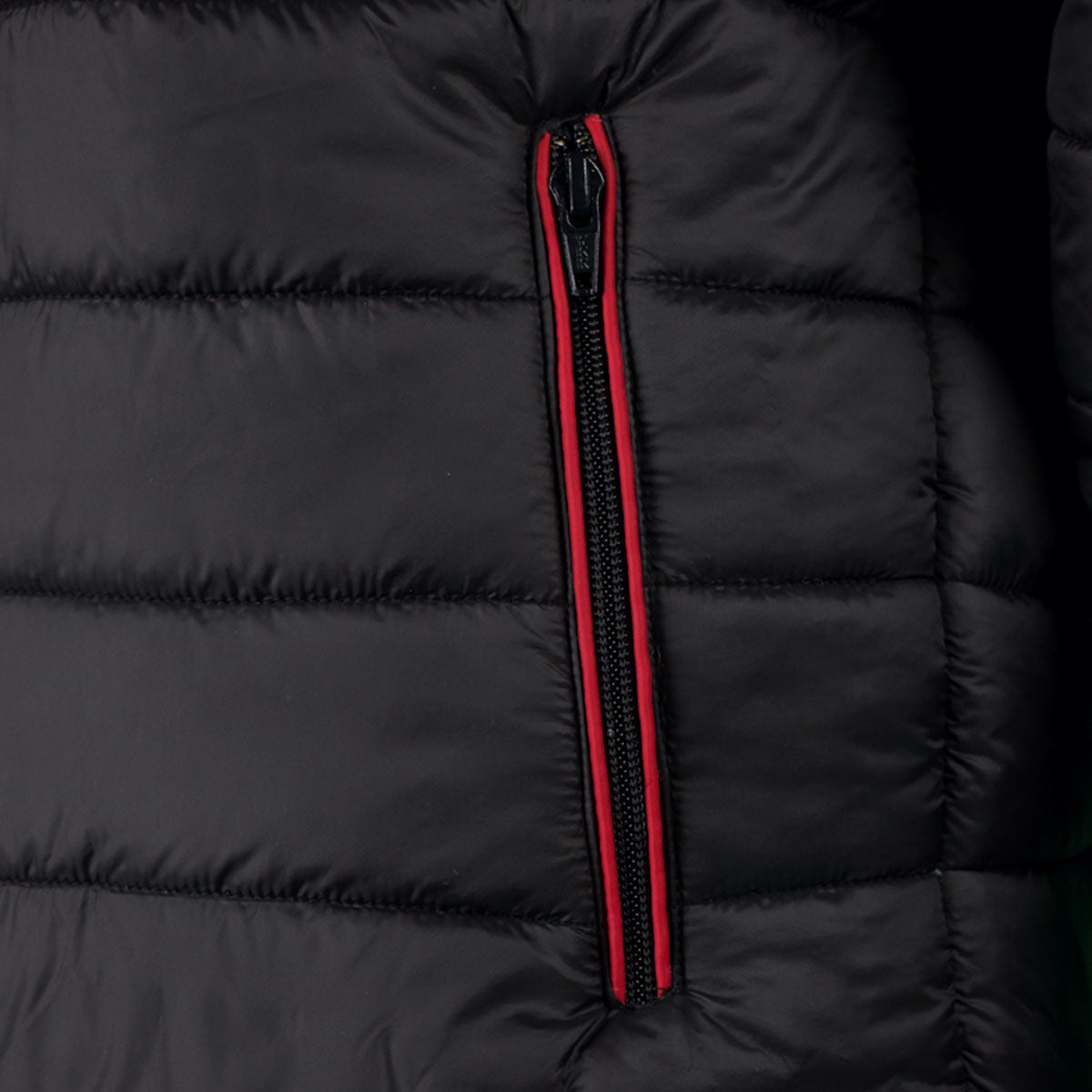 Gepolstertes Polyestermaterial mit hohem Tragekomfort. Zwei Reißverschlusstaschen. Schlichtes Design mit roten Farbakzenten an Brust und Taschen