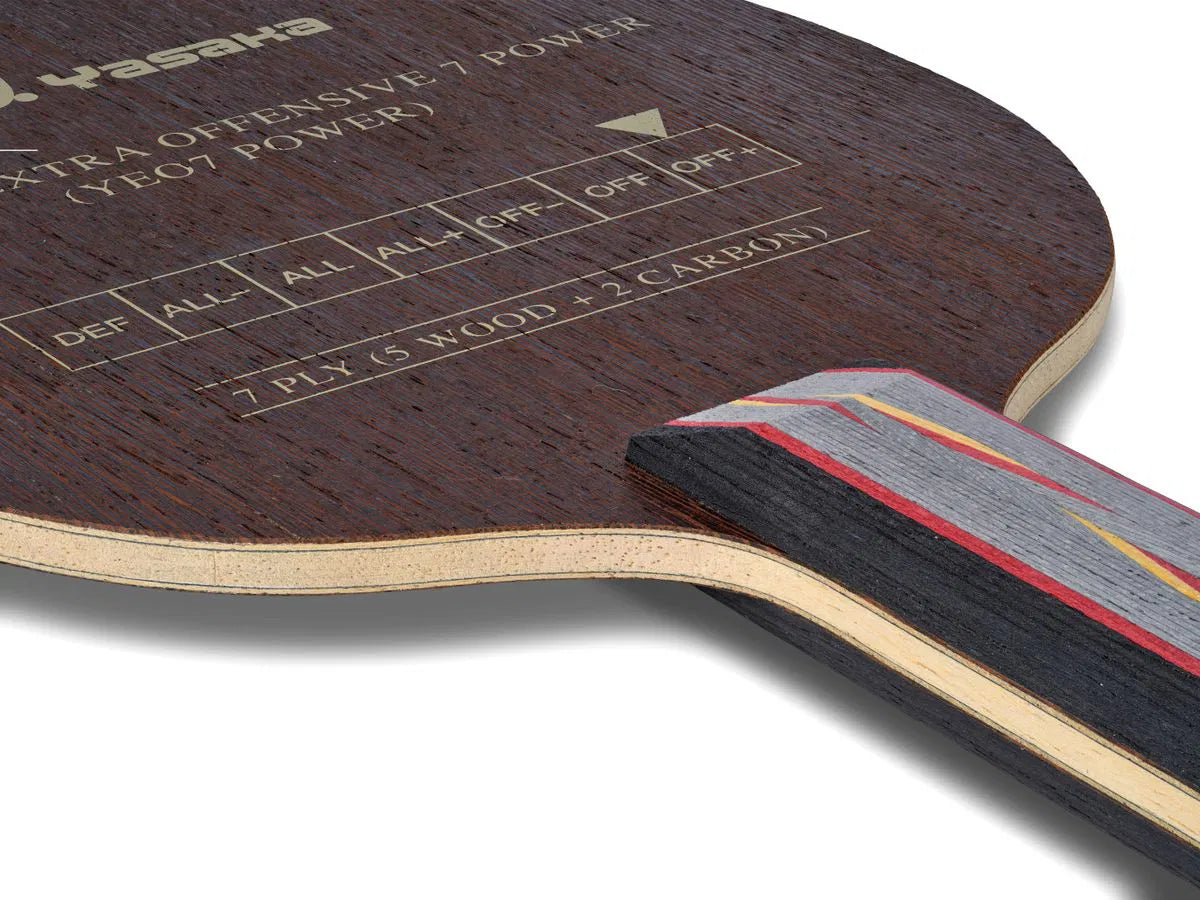 In den letzten Jahren war Yasakas EXTRA OFFENSIVE ein großer Erfolg, der von Spielern auf der ganzen Welt geschätzt wurde. Mit der Erfahrung des berühmten EXTRA OFFENSIVE-Hplz hat Yasaka ein neues Holz entwickelt, das sich an Spieler richtet, die eine überlegene Angriffswaffe suchen. Das sehr harte Außenfurnier wird mit einem mittelharten zweiten Furnier und einer dünnen und sehr leichten Carbonschicht kombiniert. Das Mittelfurnier wird so ausgewählt und bearbeitet, dass es eine perfekte Härte und Dicke aufweist. Der Klebe- und Pressprozess wurde entwickelt, um das Gleichgewicht zwischen Geschwindigkeit und Kontrolleigenschaften zu verbessern.